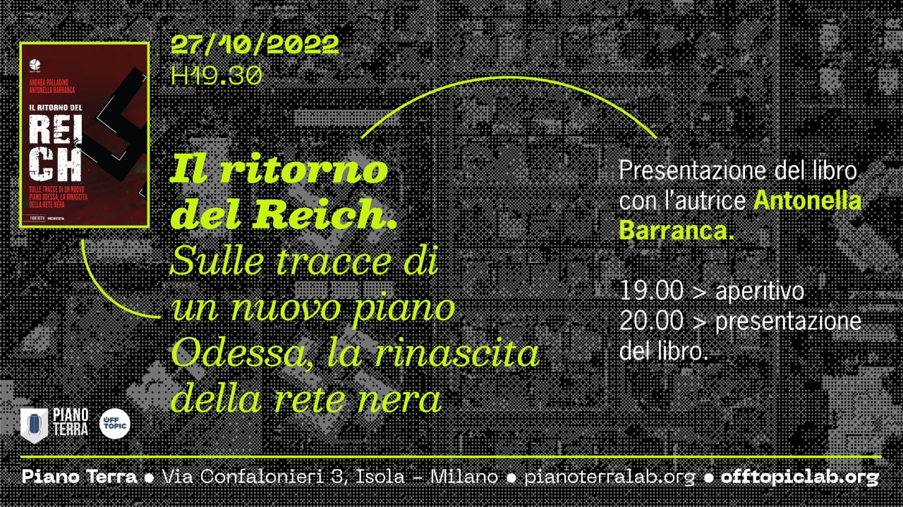 Non sono tornati, non se ne sono mai andati. Insieme ad Antonella Barranca, autrice del libro Il ritorno del Reich – Sulle tracce di un nuovo piano Odessa, la rinascita della rete nera (edizioni Round Robin, 2022), tracceremo i fili che dalla fine della II Guerra Mondiale in poi, hanno consentito all’ideologia, ai gerarchi e ai movimenti nazifascisti di sopravvivere e prosperare fino ai giorni nostri, tra connivenze con il potere economico e le alte gerarchie ecclesiastiche, servizi segreti e mondo politico.