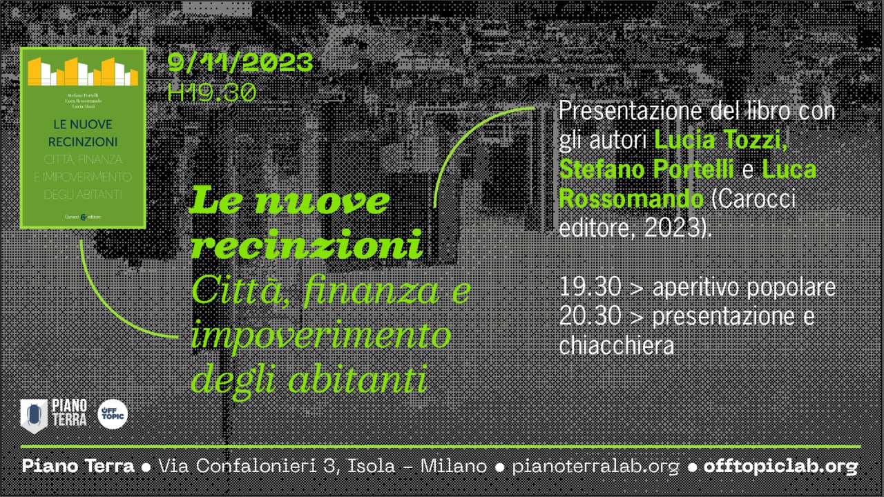 Giovedì 9 novembre a Piano Terra presentiamo con l’autrice Lucia Tozzi e gli autori Stefano Portelli e Luca Rossomando il loro ultimo volume collettivo Le nuove recinzioni: città, finanza e impoverimento degli abitanti (Carocci 2023) dedicato al fenomeno di privatizzazione della città pubblica e aumento delle disuguaglianze sociali in contesti chiave come Milano, Roma e Napoli. Con l’occasione, diremo anche due parole sulla nostra inchiesta La pressione di Airbnb su Milano. Come leggere i dati di #Airbnb e le implicazioni sull’abitare in una città sempre meno accessibile.