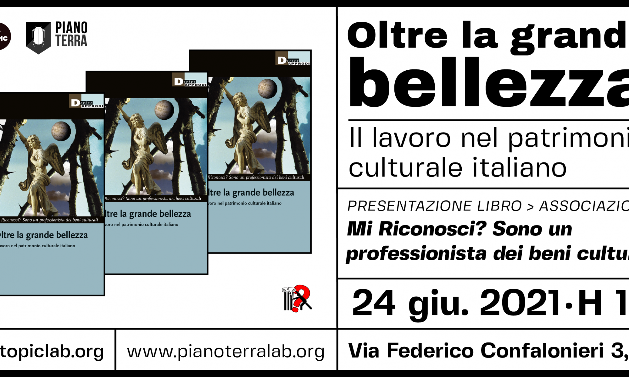 Siamo felici di ospitare a Piano Terra il volume scritto dall’associazione di lavoratrici e lavoratori del settore culturale “Mi Riconosci? Sono un professionista dei beni culturali”: un’inchiesta, una contro-narrazione del sistema culturale nel nostro Paese. Il volontariato, le esternalizzazioni, le indagini sul lavoro e questioni di genere, il turismo di massa, la gestione privatistica sono alcuni dei temi toccati all’interno del libro. Ma anche una grande proposta: un “Sistema Culturale Nazionale”, per una cultura libera e gratuita, al servizio di tutte e tutti.