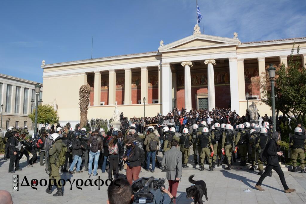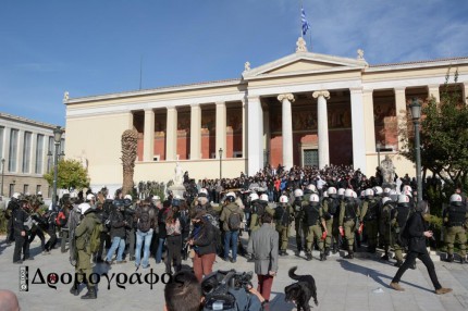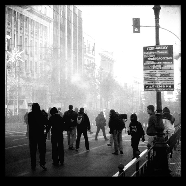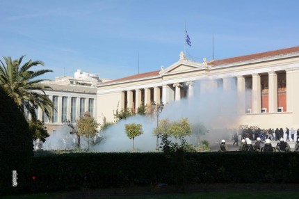 Al corteo mattutino, aperto dagli studenti, sono presenti anche i sindacati, i partiti e l’associazionismo greco. Ma sono gli studenti e i giovani i veri protagonisti della piazza: l’impressione più forte e toccante è vedere ragazzini anche giovanissimi di 13-14 anni, con la faccia già indurita e in parte consapevoli di non aver più concesso praticamente nessun futuro. Alexis era uno di loro dopotutto. E sono sempre gli studenti che, dopo essere passati da un Parlamento blindato come mai negli ultimi anni, guidano gli scontri che scoppiano davanti l’università statale, punto di partenza e di arrivo del corteo. C’è un’immagine molto bella che rappresenta lo spirito della manifestazione mattutina: gli studenti, ritirandosi dopo l’attacco della polizia, tentano di rifugiarsi sulle scalinate all’ingresso dell’ateneo, venendo così circondati; contemporaneamente, però, il resto del corteo, dopo essersi inizialmente sbandato per i lacrimogeni e le cariche, decide di mettersi a ridosso dei poliziotti per evitare l’arresto degli studenti. In Grecia, fino a poco tempo fa, la Costituzione prevedeva il diritto d’asilo dentro le università (in memoria dei caduti nella rivolta del Politecnico); questo diritto è stato eliminato di recente e quindi solo grazie alla compattezza dei manifestanti si sono potuti evitare almeno trecento fermi.