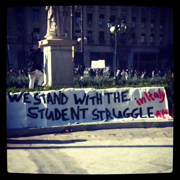 Il quinto anniversario di Alexis è stato di poco preceduto dal quarantesimo della rivolta del Politecnico del 1973;  il legame tra le due date, pur rappresentando eventi accaduti in contesti differenti, e soprattutto il legame dei due anniversari con l’attuale situazione della Grecia dicono molto di quali siano le ragioni che muovono militanti, attivisti e parte dei cittadini greci. Ancora una volta, potremmo sintetizzare il loro programma politico nelle parole d’ordine lanciate dai ribelli del ’73: pane, istruzione, libertà. E, in un certo senso, queste rappresentano anche “il grido e la richiesta” (per parafrasare Lefebrve quando parla del Diritto alla Città) delle generazioni che si stanno formando e stanno crescendo nei duri anni della Grande crisi in tutta Europa. Come detto all’inizio, la Grecia sta purtroppo rappresentando un’avanguardia, un laboratorio, un possibile esito di quella modernizzazione autoritaria che non costruisce nulla, ma polverizza le società e il loro futuro.