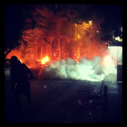 La sera invece, con l’aria ancora pesante per i lacrimogeni lanciati nelle ore precedenti, un numero maggiore di persone (oltre 10 mila) si ritrova sempre di fronte l’università per il corteo nazionale che si svolge in un clima teso, ma senza incidenti, anche davanti al Parlamento. E’ nel secondo momento, quando ci si sposta dentro Exarchia per posare un fiore e accendere una candela, in un commovente silenzio, sotto la targa di Alexis che comincia la lunga notte di Exarchia: ogni strada una barricata, ogni esercizio commerciale o albergo un punto di rifugio, ogni tetto un urlo di avvertimento e di supporto per chi si trova in strada ad impedire alla polizia di entrare nel quartiere e attaccare i manifestanti. E’ la solidarietà della bank and police free zone: gli antisommossa e i Delta riescono a più riprese ad entrare e quando lo fanno, le serrande si abbassano, le porte si chiudono e chi si trova in strada si compatta dietro l’ennesima barricata. Poi, non appena la polizia si sposta verso un’altra zona, le vie si ripopolano di persone che escono dai rifugi e i gyros o i bar riprendono la loro attività. L’aria è densa di lacrimogeni, il cui veleno entra dappertutto e rende l’aria irrespirabile, ma nessuno sembra farci troppo caso. Fino a quando non parte un nuovo attacco, non c’è un nuovo urlo che avvisa dell’arrivo della polizia e ci si nasconde di nuovo. E la notte prosegue così a fasi alterne, fino a quando in pochi non restano nelle strade e la polizia (che continua a presidiare le strade fino all’alba) non si ritira.