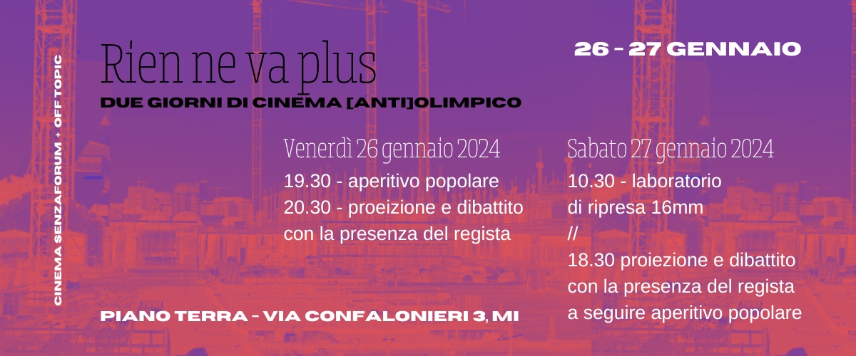 In avvicinamento alle giornate di mobilitazione diffuse contro il grande evento Olimpiadi Invernali Milano Cortina 2026 previste tra il 5 e il 10 febbraio 2024, Cine SenzaForum e Off Topic propongono, insieme a Caucaso Factory, due giornate di laboratorio cinematografico sui temi dell’impatto dei Mega Eventi su territori e popolazioni locali che si terrà a Piano Terra (via Confalonieri 3, M5 Isola, Milano). Saranno proiettati alcuni film dell’autore Enrico Masi selezionati a partire dai progetti di ricerca filmica e visuale sulla Londra delle Olimpiadi del 2012 e dalla successiva “trilogia Brasiliana” sui conflitti urbani connessi ai Giochi Olimpici di Rio 2016. Sulla base di queste esperienze, nella mattina di sabato 27 verrà proposto un laboratorio di ripresa Arriflex 16mm sui luoghi del prossimo grande evento milanese.
