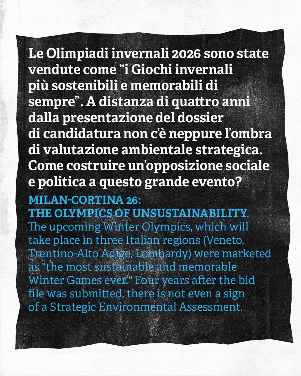 Di seguito il testo di presentazione del dibattito di sabato: “Le prossime Olimpiadi invernali, che si svolgeranno in tre regioni italiane (Veneto, Trentino-Alto Adige, Lombardia) erano state vendute come “i Giochi invernali più sostenibili e memorabili di sempre”. A distanza di quattro anni dalla presentazione del dossier di candidatura non c’è neppure un’ombra di Valutazione ambientale strategica. Questo perché è la stessa logica che pervade grandi eventi come questo ad essere incompatibile con qualsiasi idea – anche blanda – di sostenibilità. L’impatto ambientale, sociale, economico di Milano-Cortina 2026 non è solo l’ennesimo esempio di greenwashing, ma si appresta a diventare un vero e proprio paradigma di uso di risorse pubbliche in funzione dei nuovi processi di accumulazione, ovviamente a discapito della natura e degli esseri viventi. Così come sta accadendo per le Olimpiadi di Parigi 2024 e per tutti i grandi eventi di questo tipo già progettati per il prossimo futuro. Come costruire un’opposizione sociale e politica a questa Olimpiade? Come relazionarci con altre realtà internazionali che già si mobilitano o si mobiliteranno contro eventi del genere?”